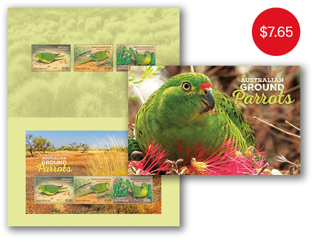 This Australian Ground Parrots stamp pack contains the three stamps and minisheet from the stamp issue presented in a high-quality folder.
