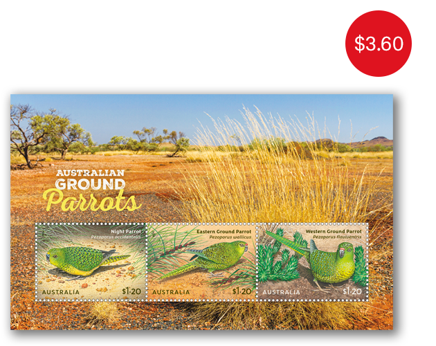 This minisheet is from the Australian Ground Parrots stamp issue and presents the three stamps in a grassland setting.