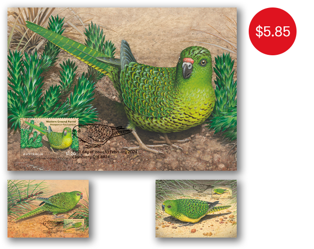 This maxicard set contains the three maxicards from the Australian Ground Parrots stamp issue.