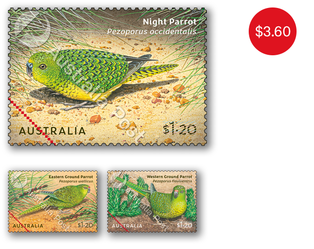 This set of stamps contains the three stamps from the Australian Ground Parrots stamp issue.