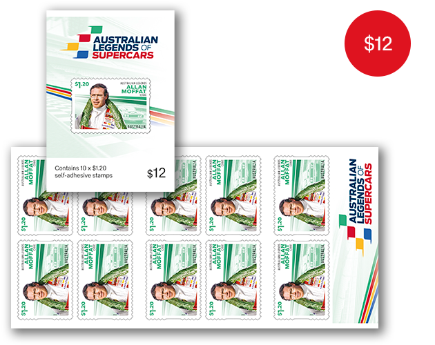 This booklet contains 10x $1.20 Allan Moffat self-adhesive stamps from the Australian Legends of Supercars stamp issue in a convenient wallet sized booklet.