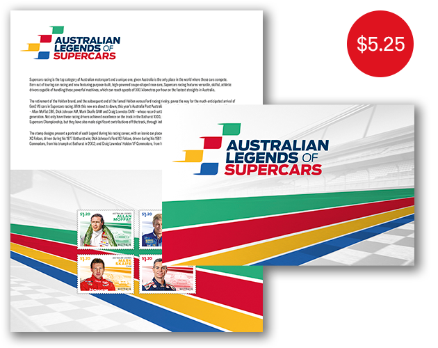 The Australian Legends of Supercars stamp pack contains all four stamps from the stamp issue presented in a high-quality folder.