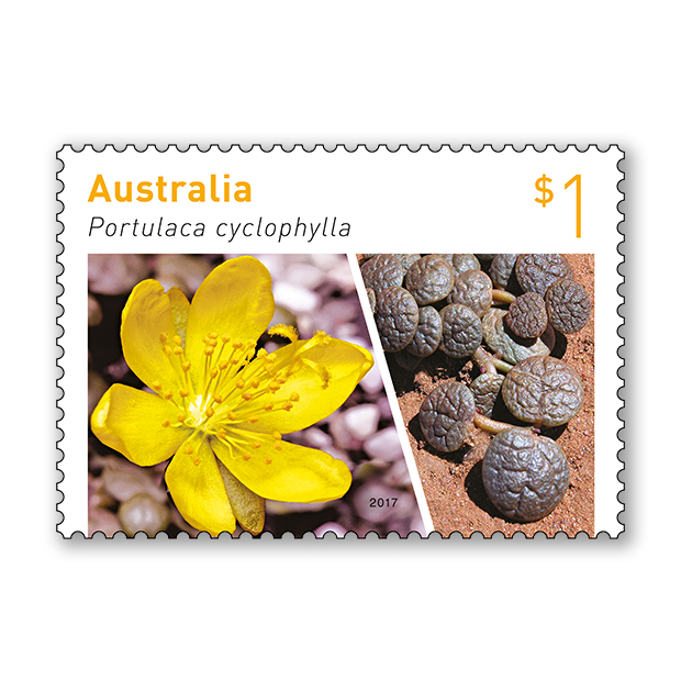 Portulaca cyclophylla has small circular brown leaves that provide a camouflage effect against its gravelly habitat. This species of the Portulaca genus is unusual in having large, showy blooms of up to 3.5 centimetres in diameter, with an extended central stigma. It is found in arid, gravel habitats of central Western Australia.