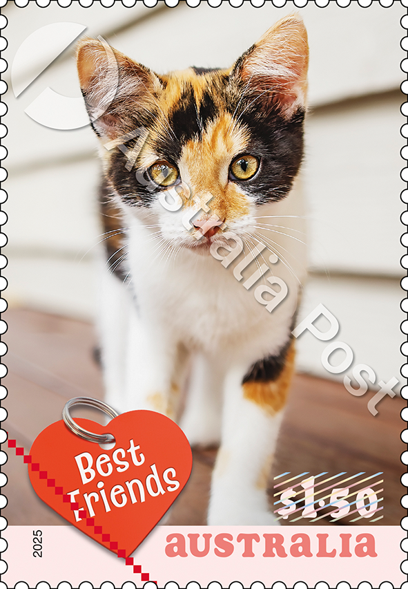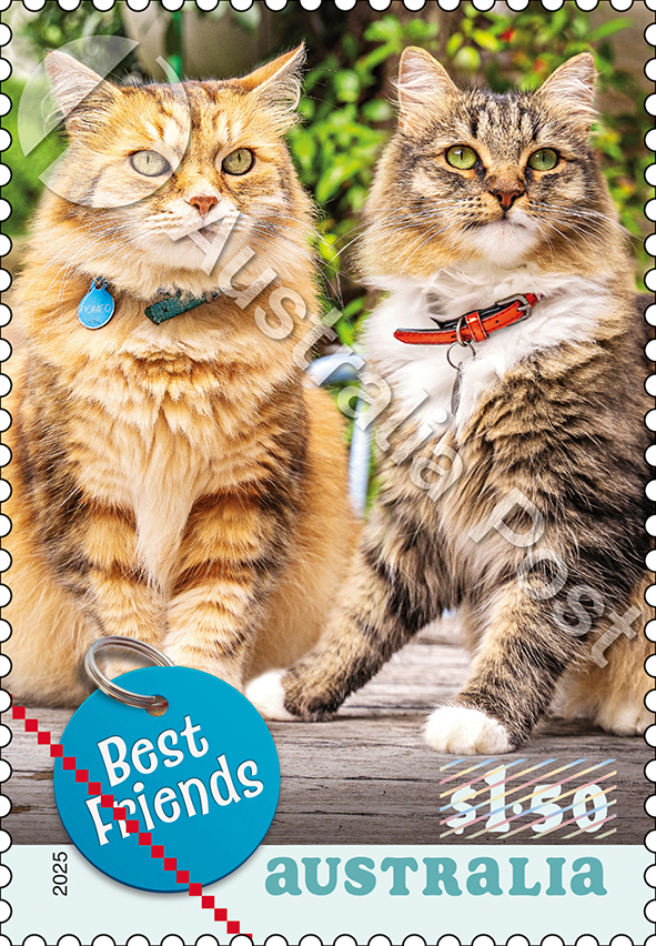 The most popular dog pure-breeds are Labrador Retriever, Border Collie, German Shepherd, Staffordshire Bull Terrier, Chihuahua and Golden Retriever; however, in recent years, mixed-breed dogs, in particular poodle-crosses, have become increasingly common. Sought-after cat breeds include Domestic Shorthair, Bengal, Siberian, Persian, Abyssinian, Australian Mist, Burmese, Siamese, Russian Blue and Ragdoll. The stamp issue features six of our “best friends”.