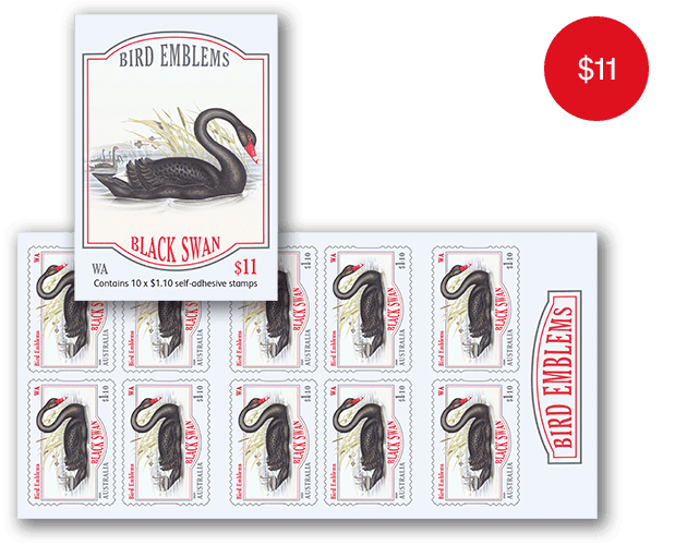 This booklet contains 10 x $1.10 self-adhesive Black Swan stamps from the Bird Emblems stamp issue in a convenient wallet sized booklet.