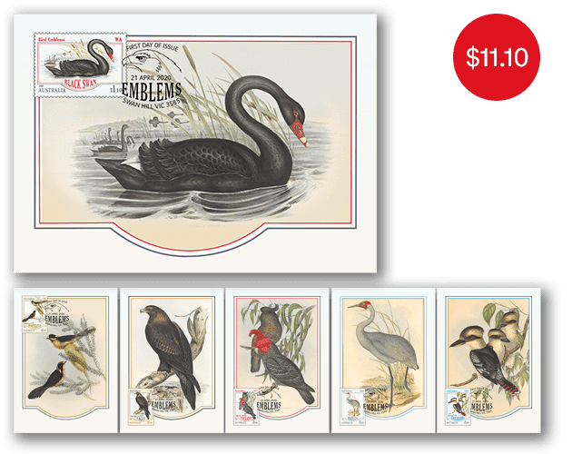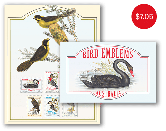 This stamp issue features six bird species that have been proclaimed as government emblems. Featured in the stamp designs are artworks from John Gould’s seven-volume The Birds of Australia, published in 1848. The sketches used to produce the lithographs in this impressive body of work were completed by Gould’s wife, Elizabeth, a talented artist. Elizabeth Gould sadly passed away in 1841, after producing more than 80 lithographic plates for the work, prior to its publication. Her sketches were then used by other artists, though predominantly H C Richter, to complete the lithographs. The images were provided by the National Library of Australia.