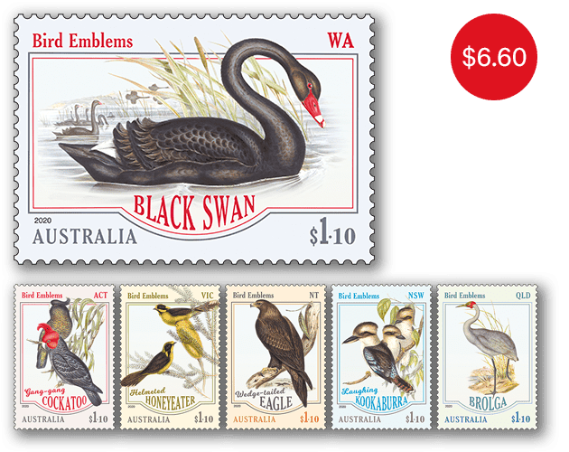 The Bird Emblems stamp pack contains all six stamps from the stamp issue presented in high quality folder.