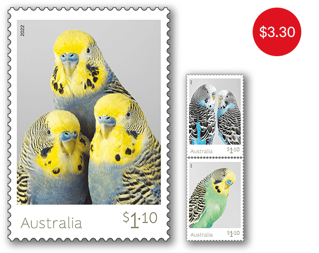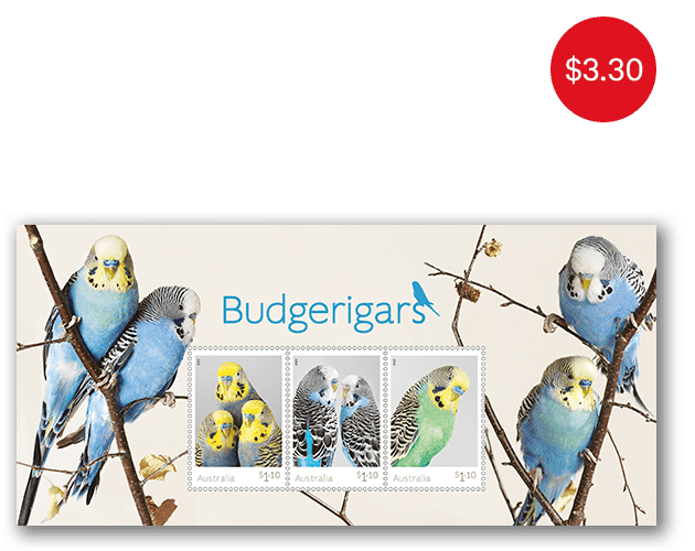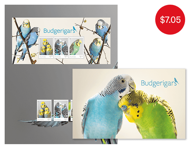 The Budgerigars stamp pack contains all three stamps and minisheet from the stamp issue presented in a high-quality folder.
