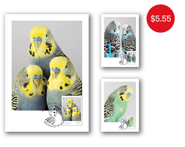 This maxicard set contains the three maxicards from the Budgerigars stamp issue.