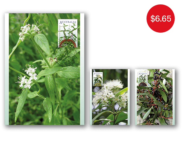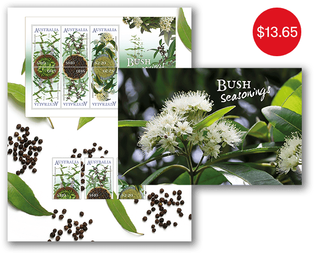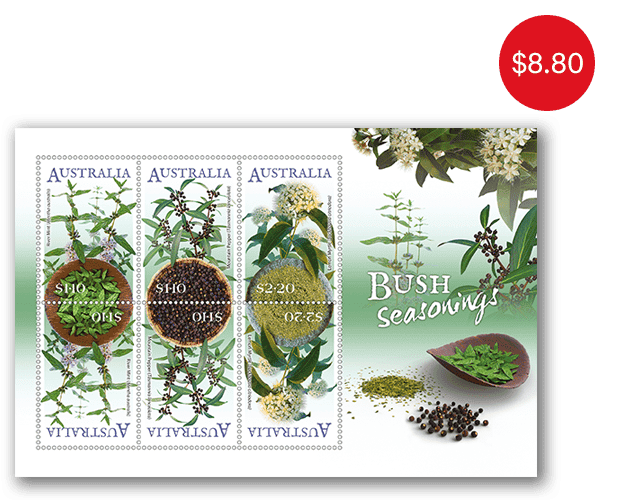 The Bush Seasonings stamp pack contains all three stamps and minisheet from the stamp issue presented in a high-quality folder.