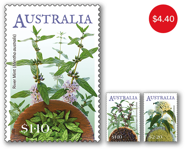 The stamps in this issue present three popular native herbs and spices, illustrated by visual artist Gavin Ryan.