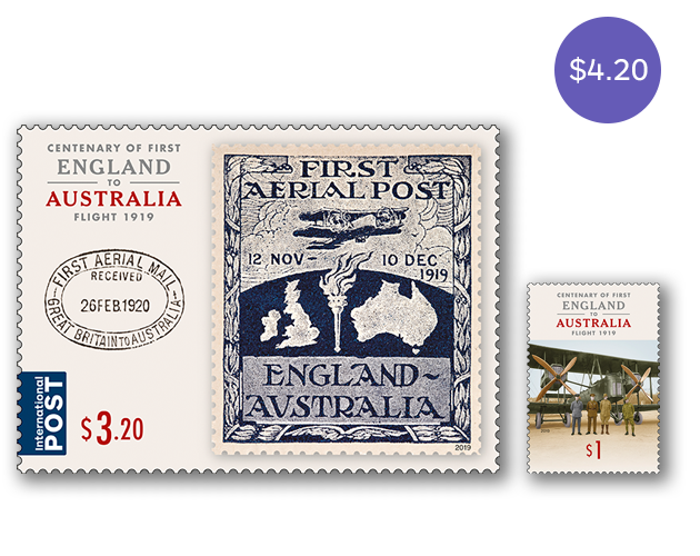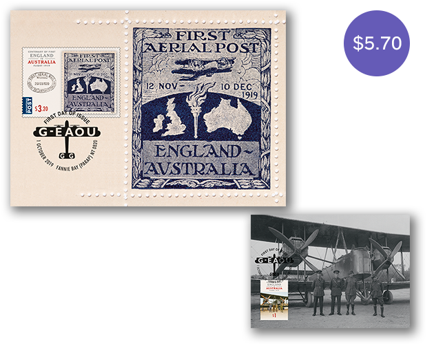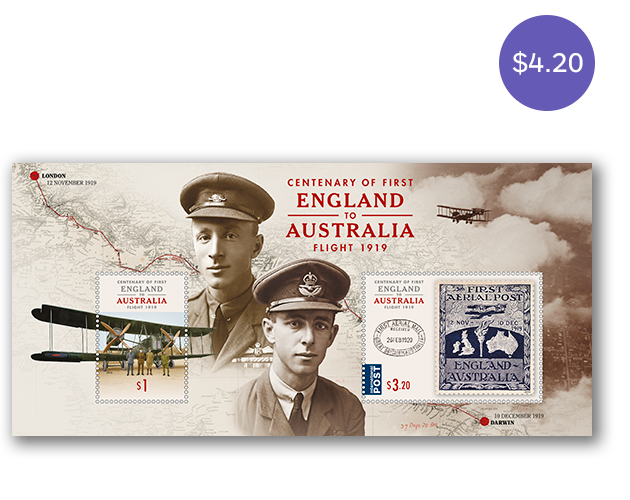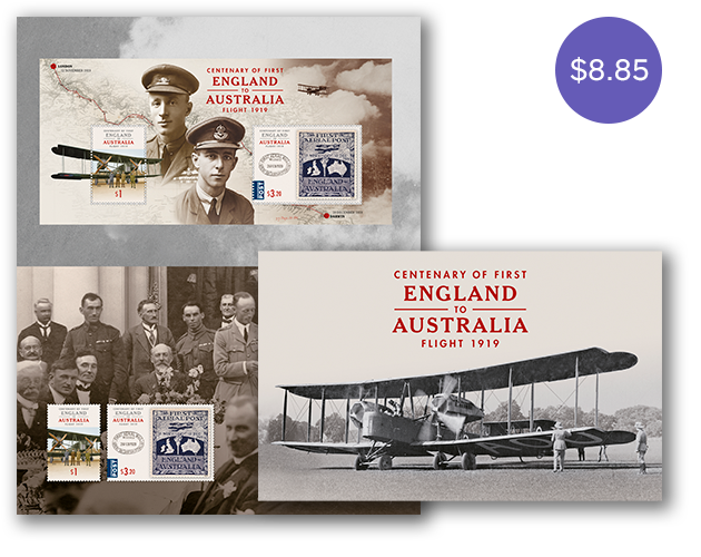 The Centenary of First England to Australia Flight stamp pack contains the two stamps and minisheet from the stamp issue presented in high quality folder.