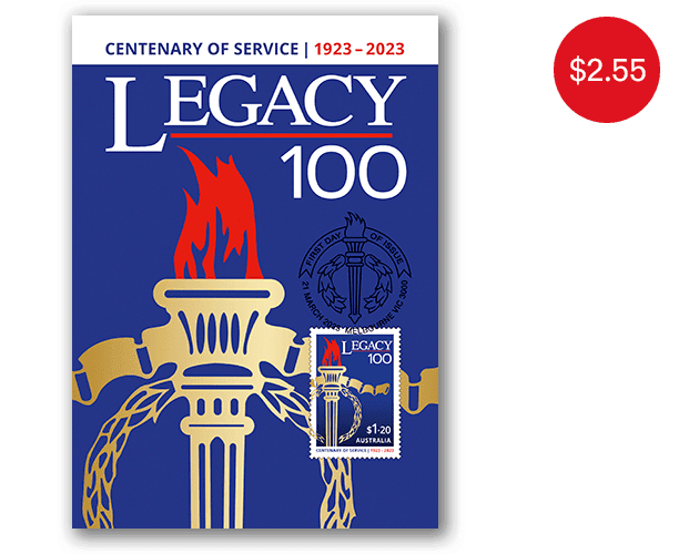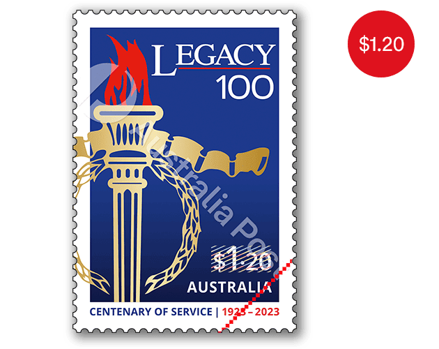 The single Centenary of Legacy $1.20 gummed stamp presents the iconic branding of Legacy Australia and echoes the colours of the Australian flag.