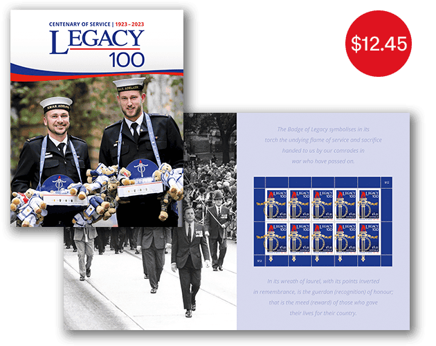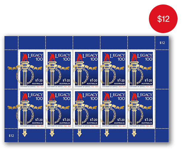 The Centenary of Legacy sheetlet pack contains the sheetlet of 10 x $1.20 stamps from the stamp issue presented in a high-quality folder.