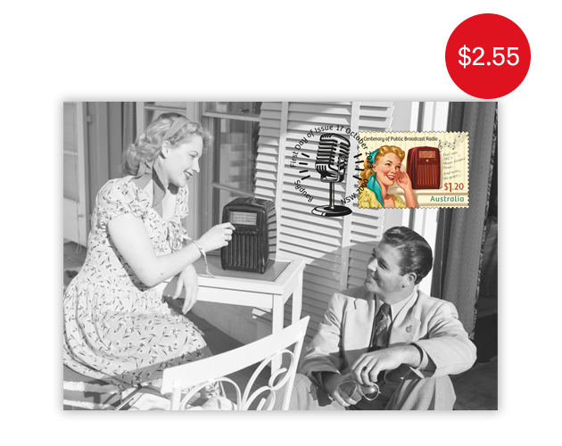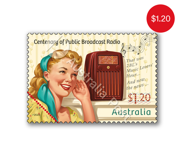 The stamp scene showcases a woman in her living room, with her ear tuned into the radio. The radio is set to 2BL, the (renamed) first station to make an official public broadcast on 21 November 1923. The radio featured in the stamp design is an AWA Radiola, released in 1949 and known as “the Fridge”, due to its shape. Music Lovers’ Hour, referred to in the typography, was a popular program of the era.