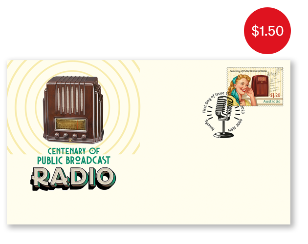 This Centenary of Public Broadcast Radio first day cover presents the postmarked gummed stamp from the issue on a complimenting cover design.