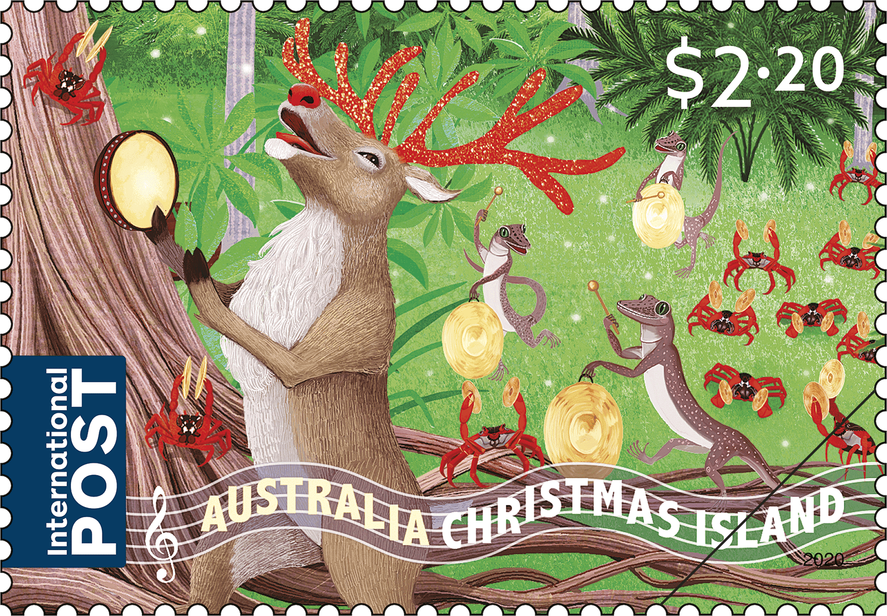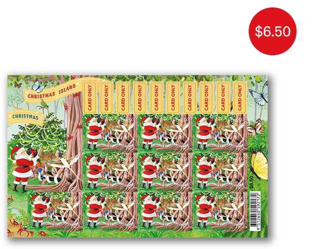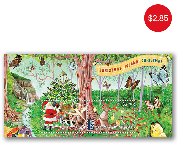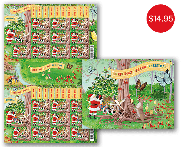 This year, Sonia Kretschmar has created a whimsical scene set under a fig tree in the Christmas Island Dales. Santa is conducting a carol-singing choir of island birds, renowned for their distinctive calls, while Rudolph leads a band of local percussionists. In the broader minisheet scene is a beautifully decorated Christmas tree, with a Christmas Island Emerald Dove perched on top, and endemic butterflies are dancing overhead.
