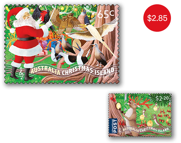 Australia Post has produced stamps for Christmas Island since 1993. This light-hearted Christmas stamp series features Santa Claus interacting with various personified island fauna.