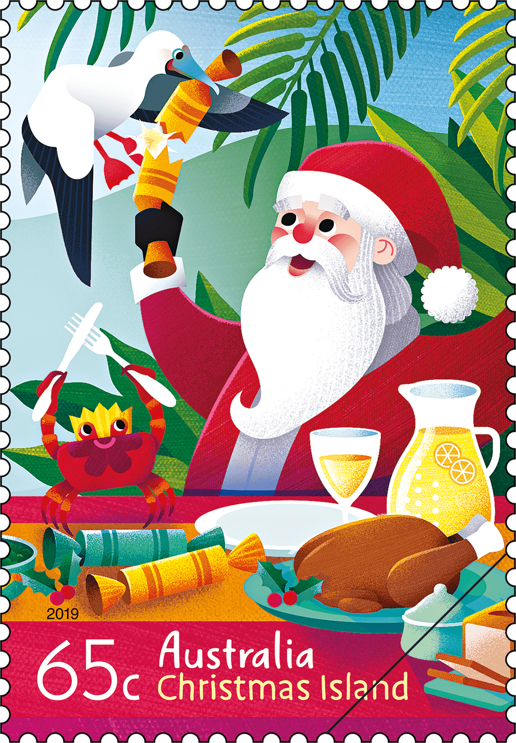The island came under Australian control in 1958, but Australia Post has produced its stamps only since 1993. Over recent years, the Christmas Island Christmas issue has taken a humorous approach to linking the festive theme to the island’s name.