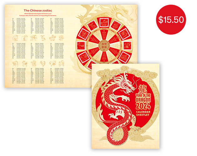 This Christmas Island Lunar New Year of the Dragon Calendar Sheetlet Pack presents Chinese zodiac details and the stamp designs in a circular sheet format.