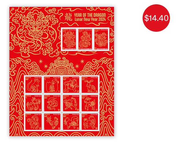 This Christmas Island Lunar New Year of the Dragon zodiac sheetlet presents all of the 2024 Year of the Dragon zodiac stamps.