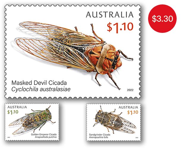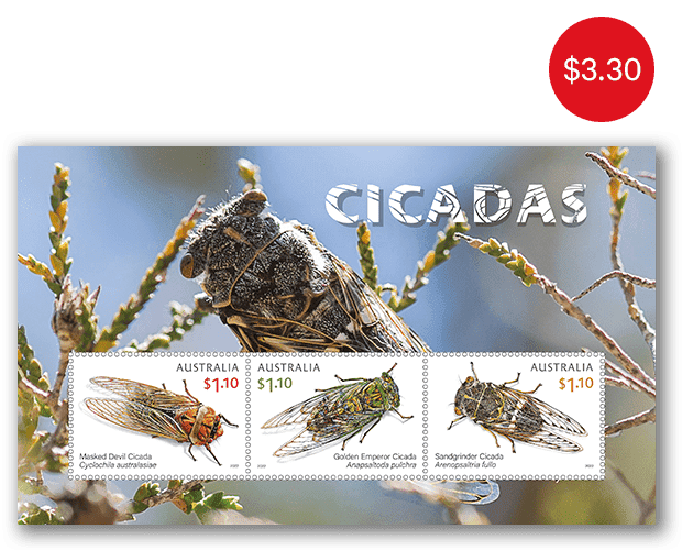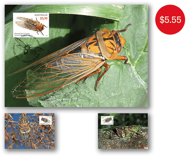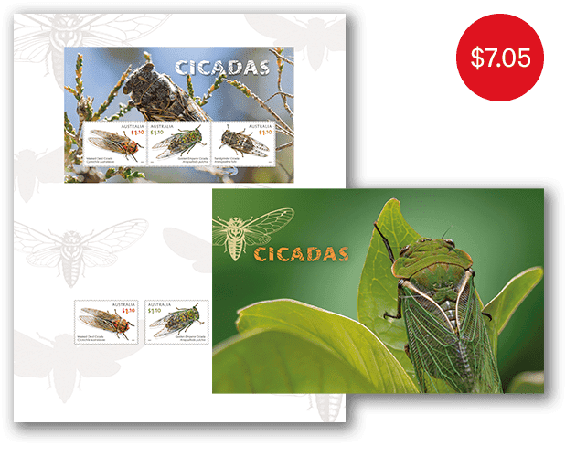 The Cicadas stamp pack contains all three stamps and minisheet from the stamp issue presented in a high-quality folder.