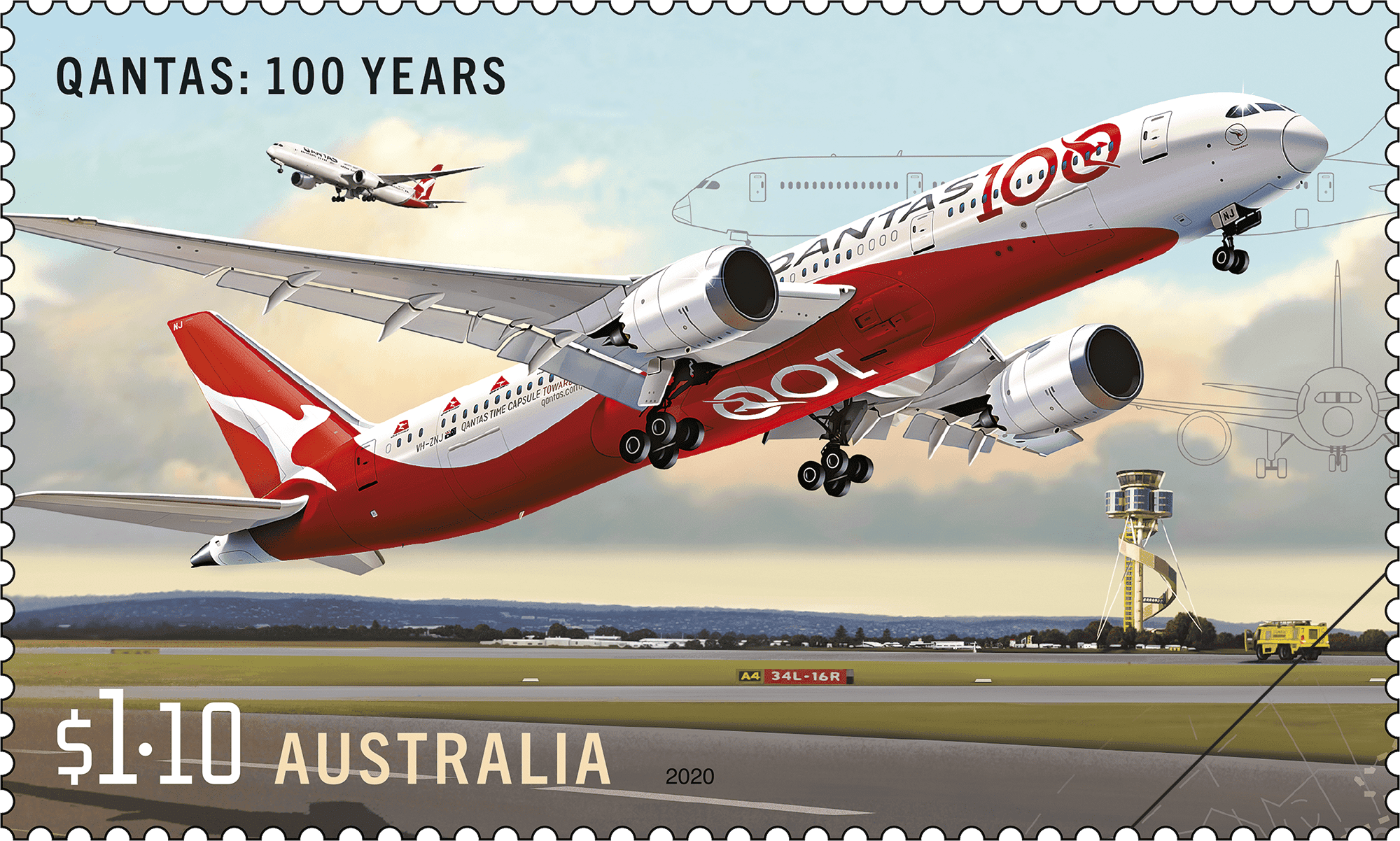 In 1921, the Qantas fleet consisted of two biplanes. Now in its centenary year, Qantas is one of the oldest and safest airlines in the world and is Australia’s major national and international carrier. In the centre of the stamp scene is the Qantas Dreamliner aircraft, with special centenary livery, taking off from Sydney Airport.