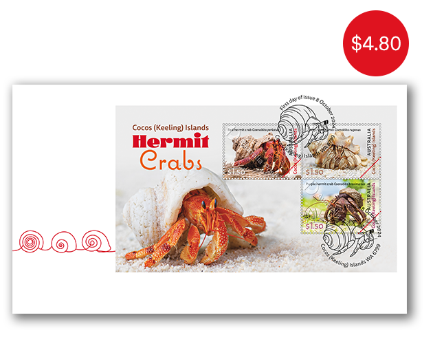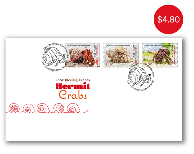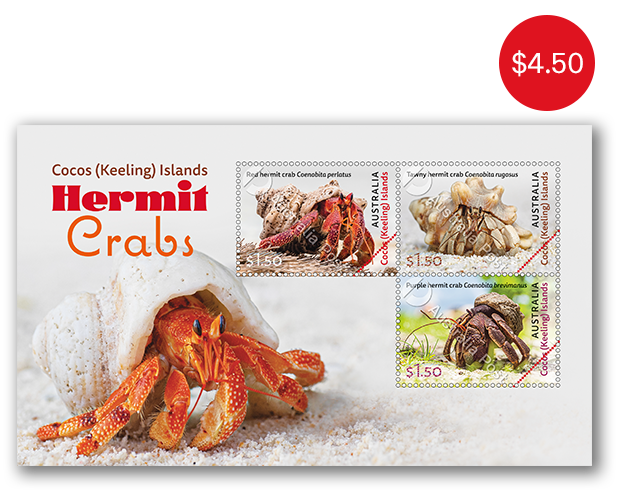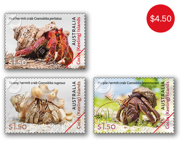 This issue feature the three hermit crabs from the genus Coenobita found on the Cocos (Keeling) Islands. These hermit crabs spawn in the ocean but are terrestrial as adults, surviving on land by retaining moisture in their shells.