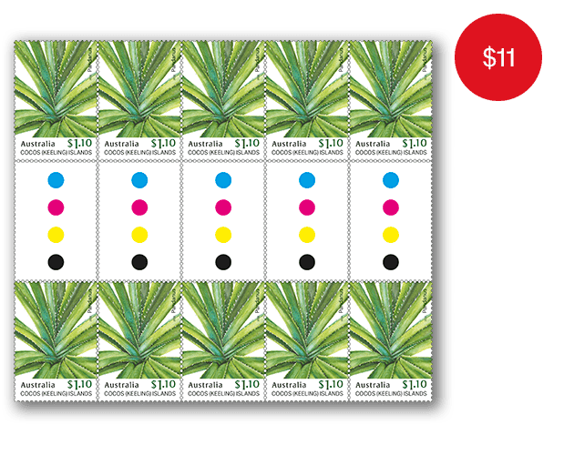 The gutter strip consists of 10 x $1.10 Pandanus Leaves stamps from the Cocos (Keeling) Islands Pandanus stamp issue.