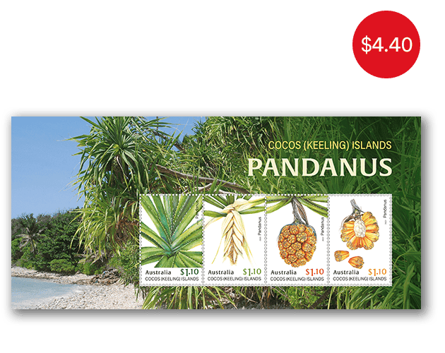 The Cocos (Keeling) Islands Pandanus minisheet consists of the four stamps from the issue incorporated into a miniature stamp sheet.