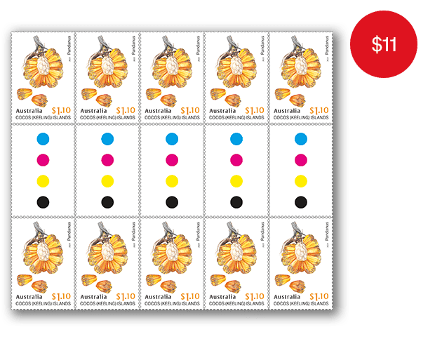 The gutter strip consists of 10 x $1.10 Pandanus Segmented Fruit stamps from the Cocos (Keeling) Islands Pandanus stamp issue.