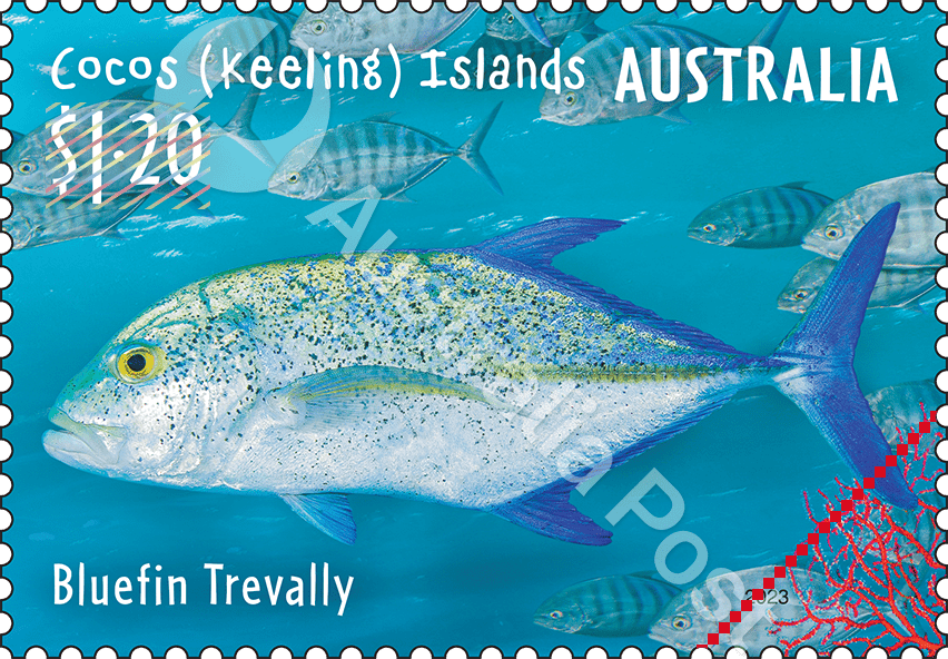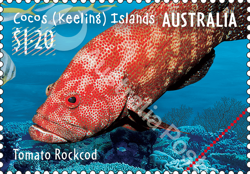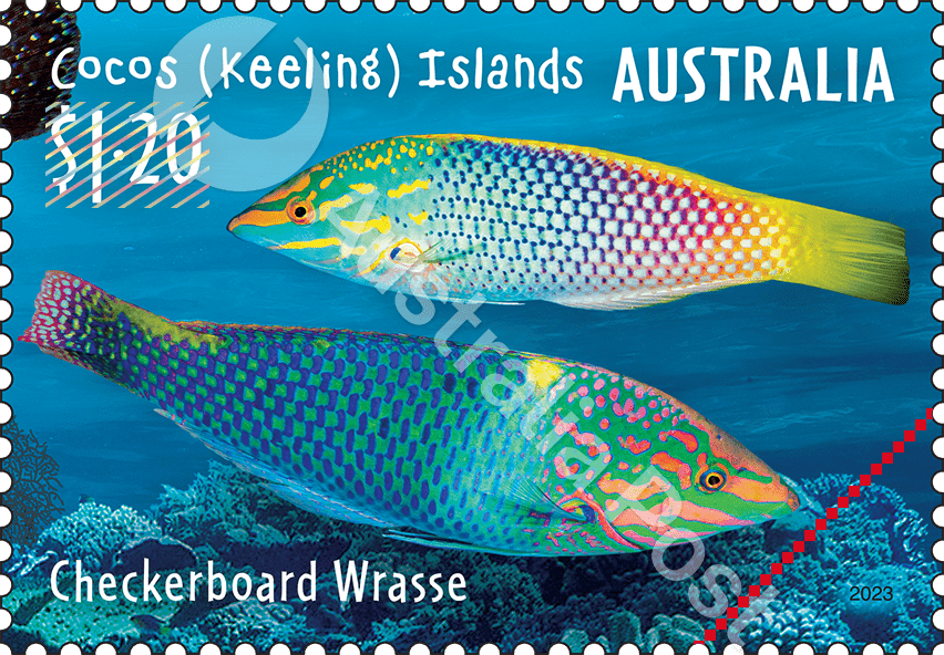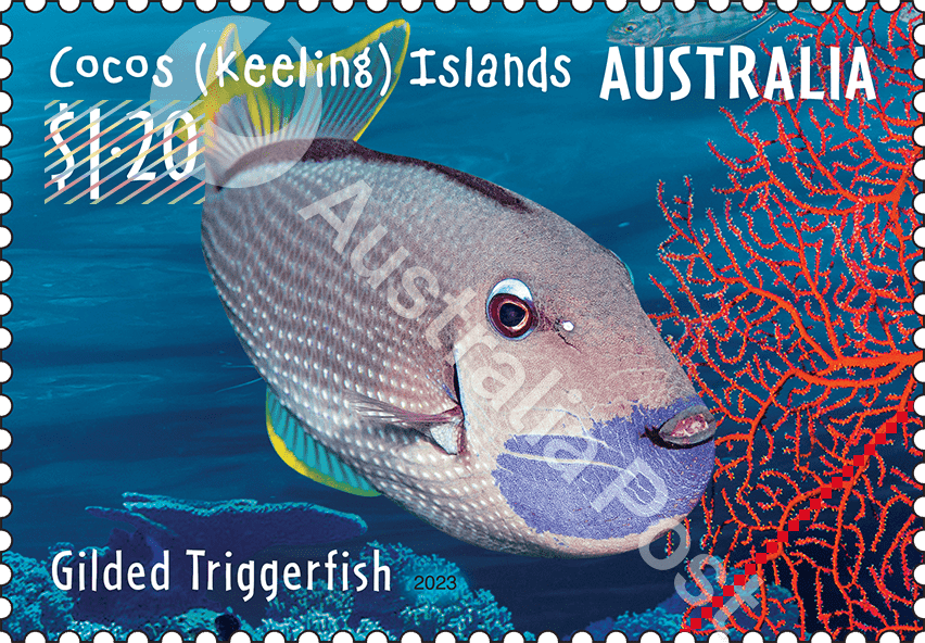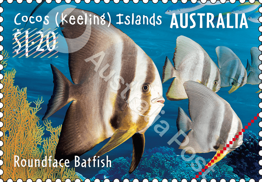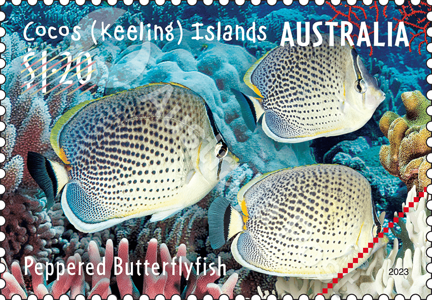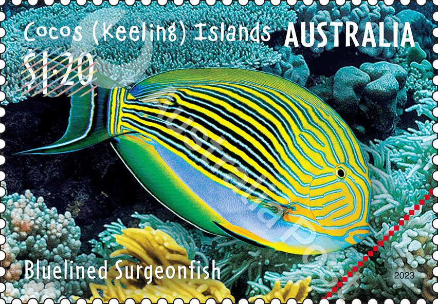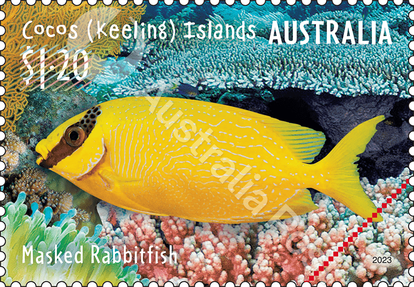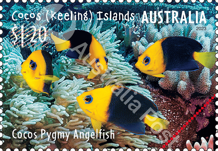 This issue comprises 10 stamps, which together build an imagined subaquatic scene in the clear waters of this tropical territory. The photographs, taken by sometimes Cocos resident Karen Willshaw, represent a range of species belonging to nine fish families. Given the varying sizes of the fish, some artistic licence has been taken in showing them in a single scene.