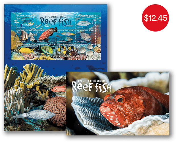 The Cocos (Keeling) Islands Reef Fish stamp pack contains the minisheet from the stamp issue presented in a high-quality folder.