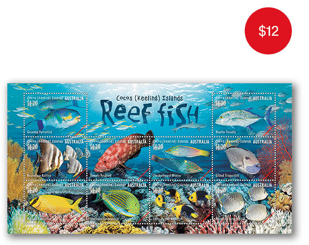 The Cocos (Keeling) Islands Reef Fish set of stamps is printed and sold as a large minisheet of 10x $1.20 stamps.
