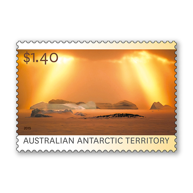 However, some beautiful effects can be observed. In the freezing dry atmosphere of the Australian Antarctic Territory frozen water vapour remains in the air as suspended ice crystals. The reflection of light on these crystals creates some spectacular atmospheric effects such as solar pillars, sun dogs and solar halos. These beautiful stamps demonstrate some of the amazing colours that can be observed in the Australian Antarctic Territory.