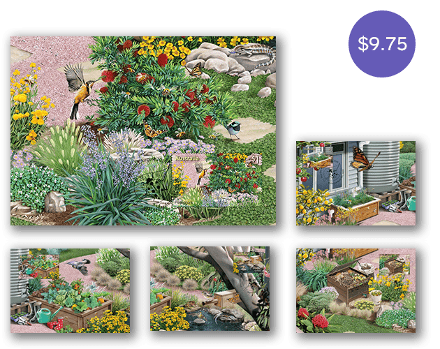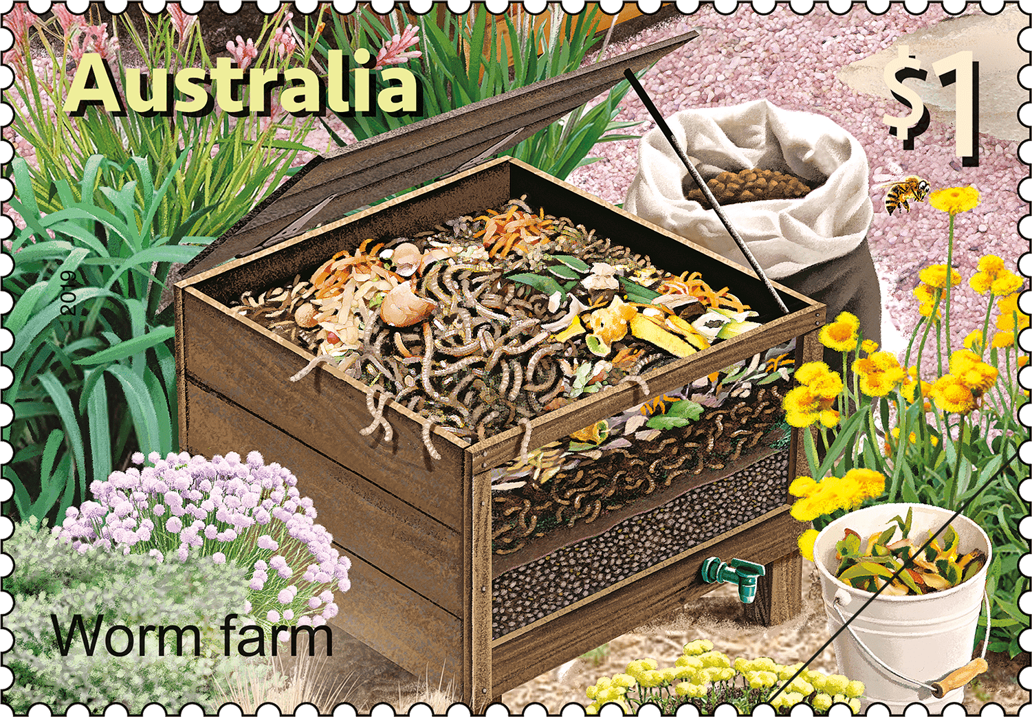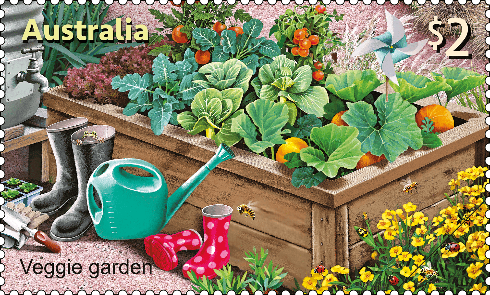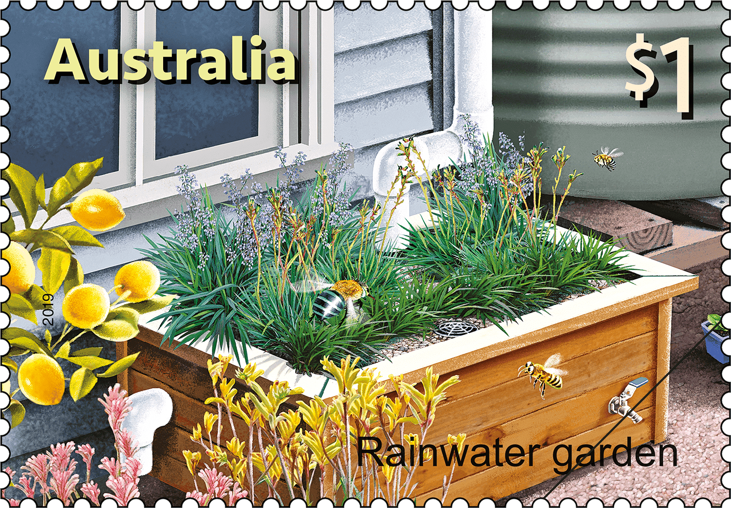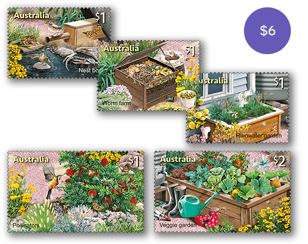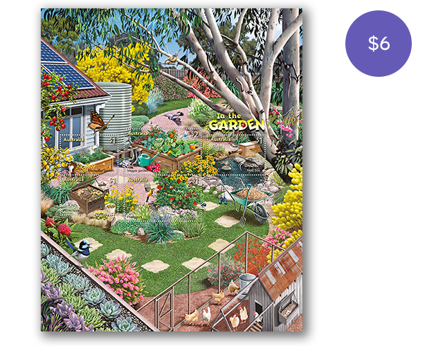 The “In the Garden” stamp issue presents a sustainable garden scene. It is set within a fictitious Australian suburb in a temperate climate. The garden includes perennial native trees, shrubs and groundcover plants that don’t require a lot of water and which attract helpful animal species to the garden, including pollinating birds and insects.