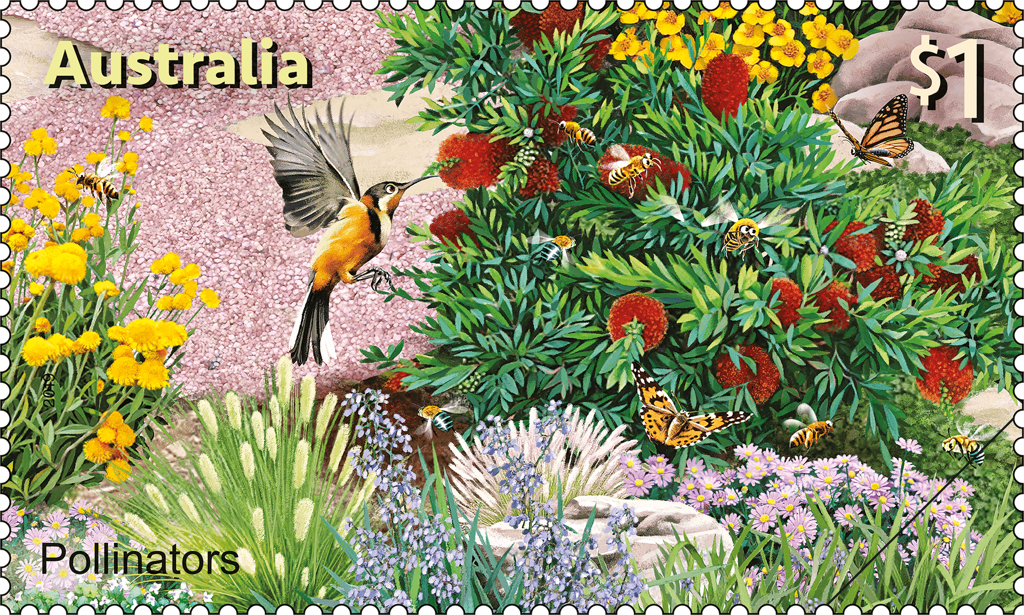 On this stamp, we can see an Eastern Spinebill (Acanthorhynchus tenuirostris), a honey-eater found in south-eastern Australia that feeds on the nectar of Bottlebrush (Callistemon) flowers. The Brachyscome daisies and Clustered Everlasting daisies attract pollinators such as honey bees, Painted Lady butterflies and native bees.