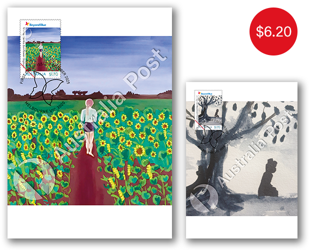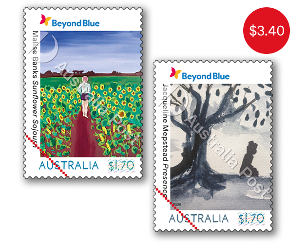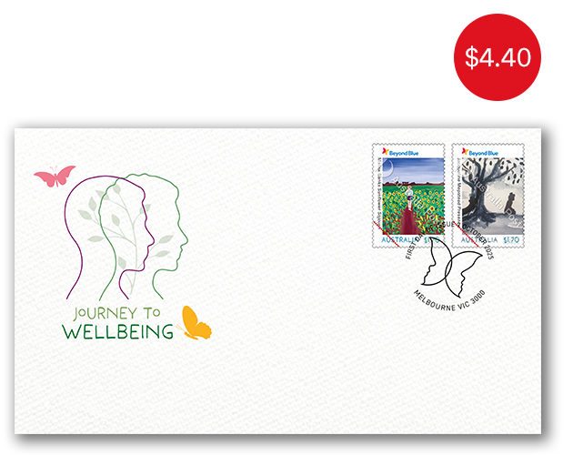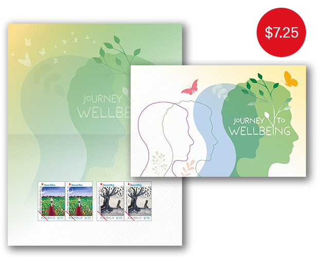 From connecting with nature to being present and mindful, there are many ways we can look after our mental health. Australia Post is proud to partner with Beyond Blue to support mental health and wellbeing in our community and connect people to important information and support. This stamp issue, Journey to Wellbeing, features artwork by Beyond Blue’s lived-experience community members depicting their own unique and personal representation of how they connect and look after their mental health. The issue aims to raise awareness about mental health and highlight the importance of looking after our mental health and reaching out for support early. Everyone’s mental health journey is different, and our stamps symbolise this personal journey.