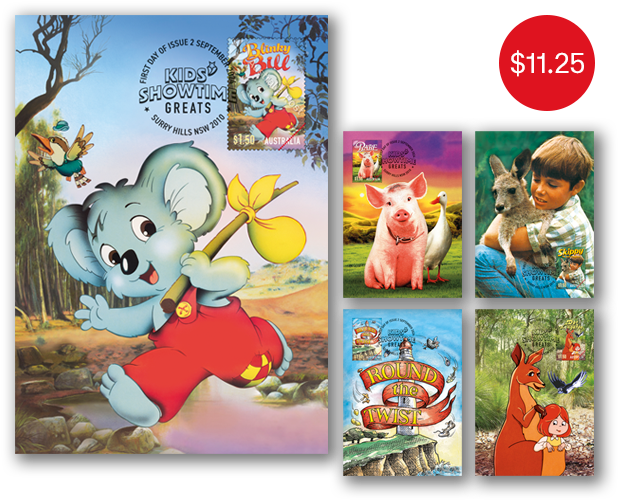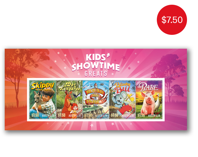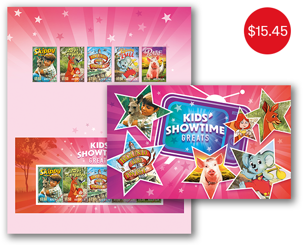 This Kids’ Showtime Greats stamp pack contains the five stamps and minisheet from the stamp issue presented in a high-quality folder.