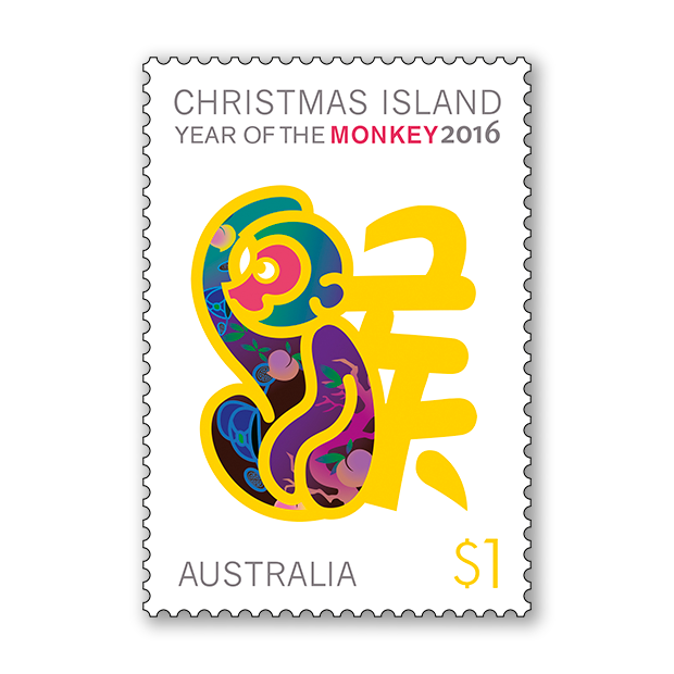 The Christmas Island Lunar New Year: Year of the Monkey 2016 stamp issue is available (while stocks last) and also at participating Post Offices and via mail order on 1800 331 794.
