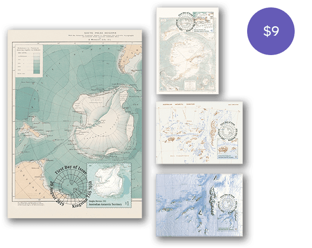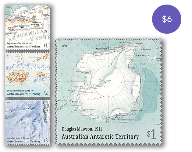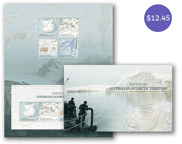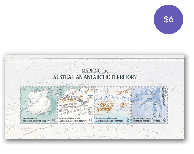 This stamp issue celebrates more than 100 years of Australian mapping of the Antarctic continent, from Mawson’s early surveys to the computer-assisted maps of the 1990s.