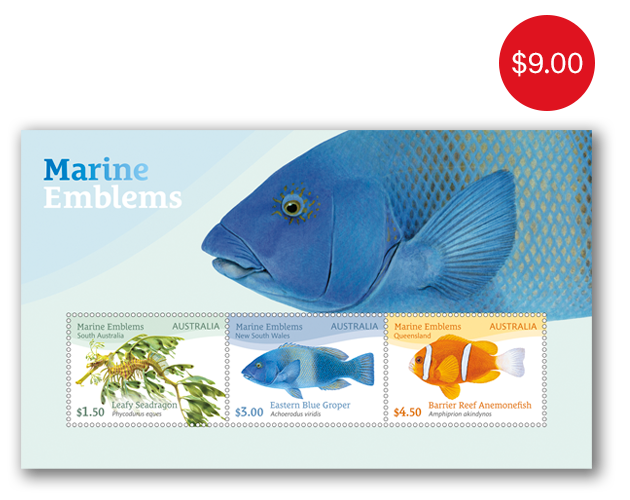 This minisheet is from the Marine Emblems stamp issue and presents the three stamp designs with an Eastern Blue Groper in the background.