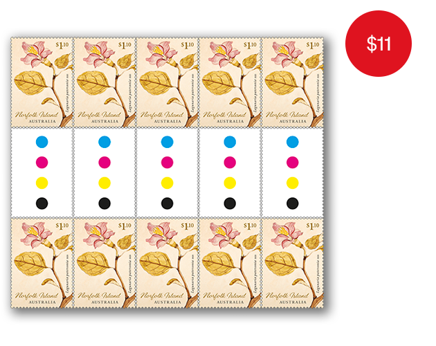 The gutter strip consists of 10 x $2.20 Ungeria floribunda stamps from the Norfolk Island: Early Botanical Art stamp issue.