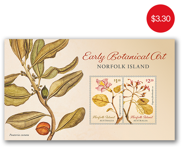 The Norfolk Island: Early Botanical Art minisheet consists of the two stamps from the issue incorporated into a miniature stamp sheet.