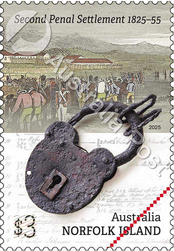 The background of the stamp shows a detail from Norfolk Island – the convict system, wood engraving, London, 12 June 1847, National Library of Australia, PIC Drawer 3843 #S9883. The text is taken from Norfolk Island – Returns, 1828-29, [4/117], Reel 764, State Library of New South Wales.