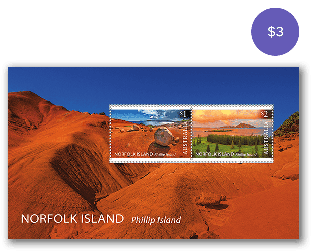 The Norfolk Island: Phillip Island Landscapes minisheet consists of the two stamps from the issue incorporated into a miniature stamp sheet.
