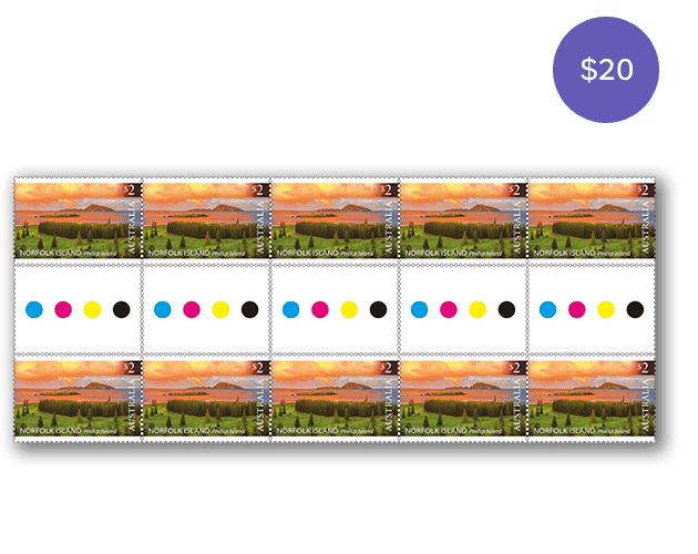 The gutter strip consists of 10 x $2 stamps from the Norfolk Island: Phillip Island Landscapes stamp issue.