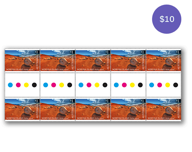 The gutter strip consists of 10 x $1 stamps from the Norfolk Island: Phillip Island Landscapes stamp issue.