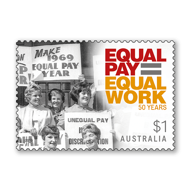 The stamp design features a graphic rendition of the slogan current at the time “Equal Pay for Equal Work”. The photograph, courtesy of The Age, shows women workers demonstrating during the 1969 Equal Pay Case outside Trades Hall, Carlton, Victoria.