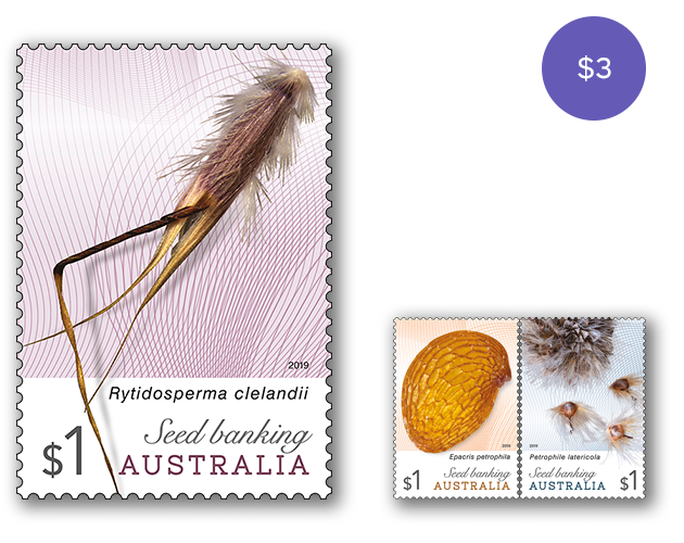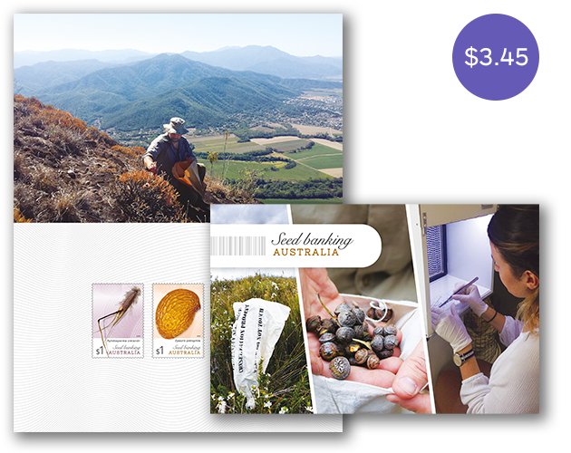The Seed Banking Australia stamp pack contains all three stamps from the stamp issue presented in high quality folder.